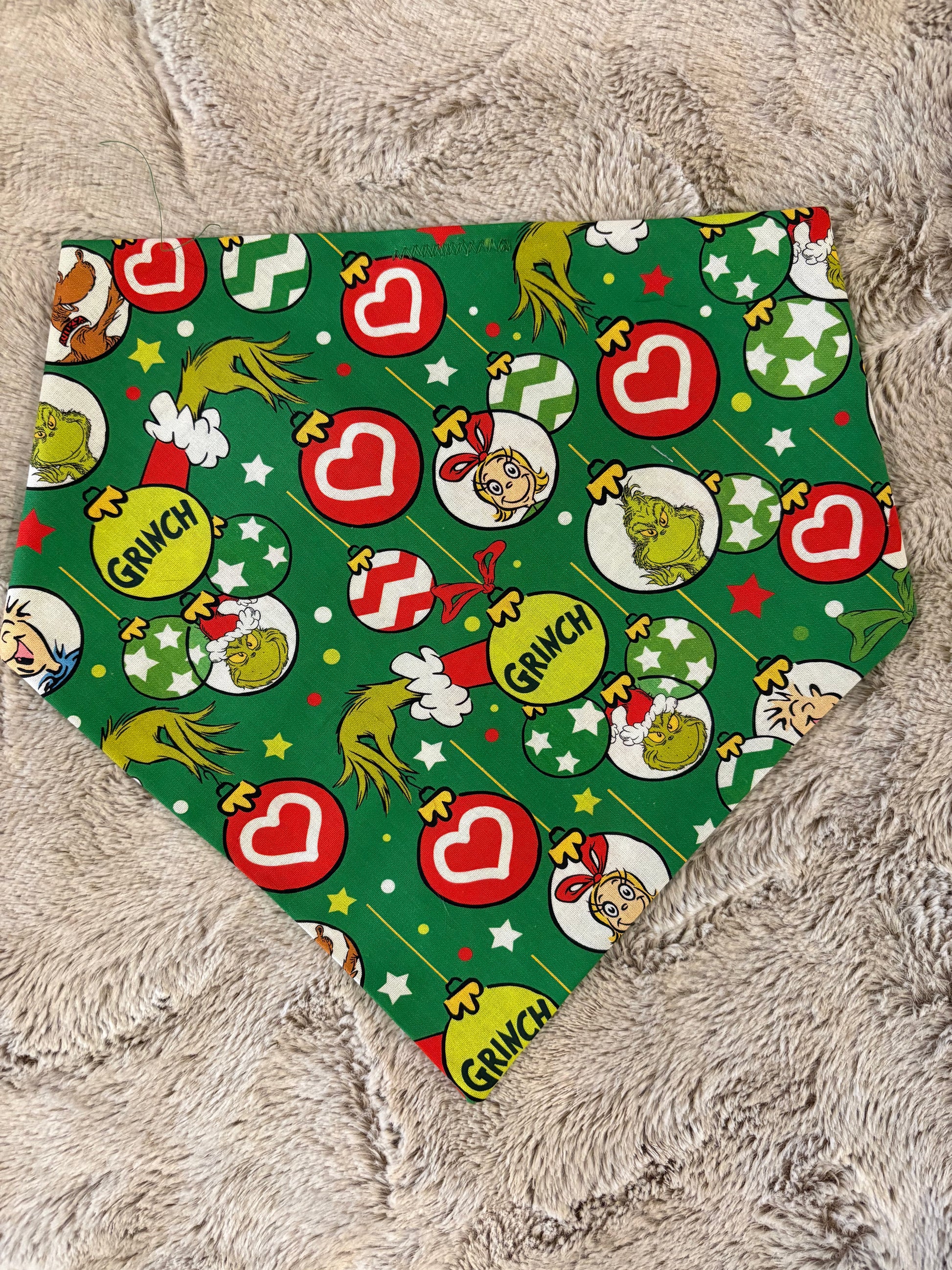A festive holiday bandana inspired by everyone’s favorite green grump and his tiny, cheerful friend. Perfect for pets who steal hearts…and maybe a cookie or two. Handmade with our patent-pending breakaway clasp.